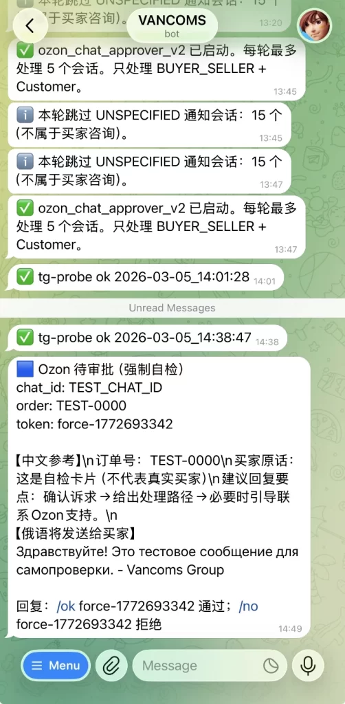 这套系统的核心逻辑是:当 Ozon 买家发送咨询消息后,系统会通过 API 将消息同步到 Telegram 审批群,由运营人员进行人工确认;确认后,OpenClaw 会自动调用 Ozon API,将审核通过的回复发送给买家。